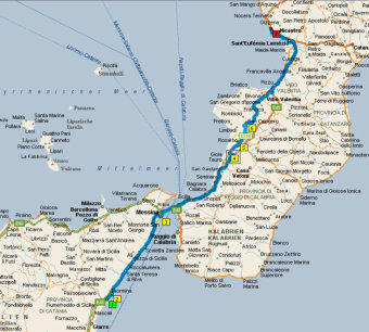 Der Tag heute beginnt wieder mit leuchtend blauen Himmel und die Sonne schickt schon Ihre Kraft zu uns.Wir fuhren über Taormina nach Messina zur Fähre und bezahlten bei der Rückfahrt 3.-- € weniger als bei der Hinfahrt.Wir fuhren Richtung Pizzo und benutzten aber die Nebenstraßen entlang der Küste, unsere Straßenkarten waren auch nicht die besten, daher war eine Irrfahrt schon wieder vorgegeben, es war aber kein Fehler sondern nur 50 km Umweg, aber sehr schön daher kann ich über das Navi und die Straßenkarten nicht meckern. Bei dieser Gelegenheit konnten wir bei einen Bauern noch günstig, Frisches und Schönes Obst und Gemüse kaufen. Gegen 18:30 Uhr kamen wir bei unserem Ziel Falerna Manina an. Am Parkplatz standen schon ca 20 Franzosen mit Ihrem Womo und hatten eine Besprechung bezüglich der geführten Reise. Der Reiseführer hatte natürlich einen riesigen Concord mit allen Feinheiten aufgestellt. Wir bereiteten uns ein Abendessen und gingen dann noch 2 Stunden den Strand entlang. Da dieser Ort voll auf Toruisten ausgerichtet ist war natürlich um diese Jahreszeit keine Geschäfte oder Restaurants geöffnet.Um 23 Uhr als Ruhe einkehrte gingen wir auch zu Bett. Morgen wollen wir bis Paestum fahren und den Griechischen Poseidontempel besuchen.
