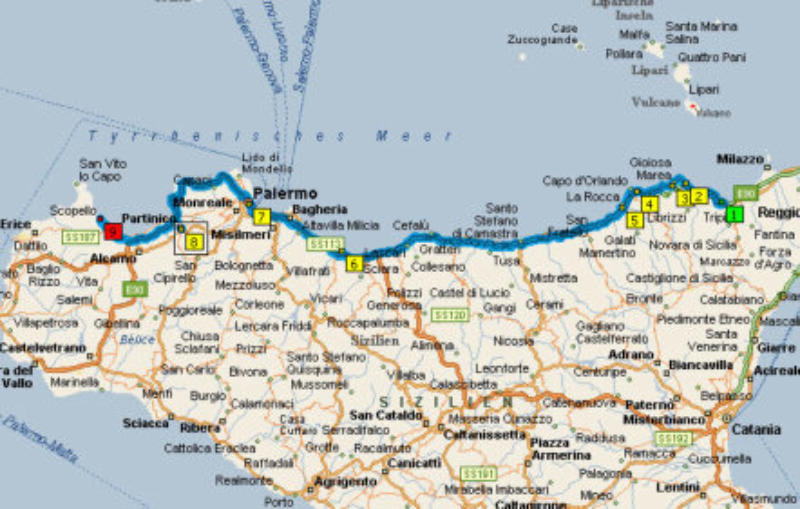 Es ist ein wunderschöner Tag strahlender Sonnenschein.Wir haben das Frühstück in der Sonne bis Uhr 11.00 genossen und fahren entlang der Küste Richtung Palermo. Palermo hat über 100 Sehenswürdigkeiten und das Womo wäre den ganzen Tag ohne Aufsicht, dieses Risiko wollte ich aber nicht eingehen, unsere Hunde müssten auch den ganzen Tag im Womo sein.In diesem Falle wäre es günstig wenn mehrere Womo Fahrer sind damit einer immer bei den Fahrzeugen bleibt und der Rest ohne schlechtes Gefühl auf Besichtigung gehen kannSan Giovanni degli EremitiSan Giuseppe dei Teatini. Wir fuhren zum Campingplatz Scopello, der hoch über der Bucht Castellammari del Golf liegt.