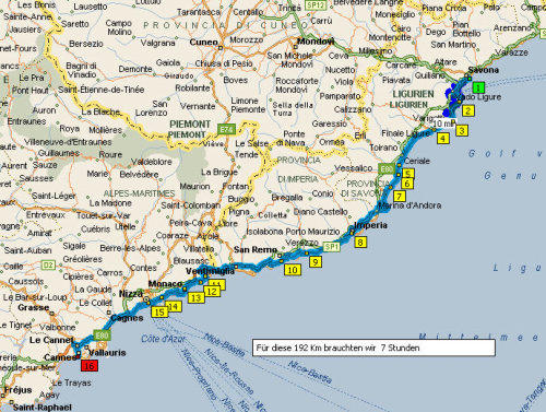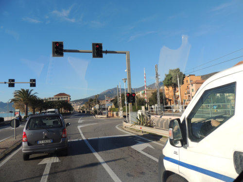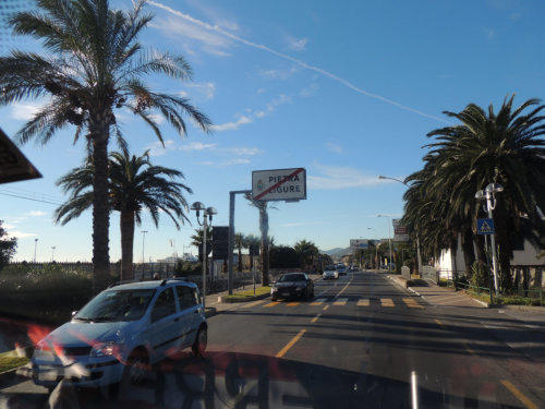 Heute ist ein strahlender Tag,die Sonne lacht vom Himmel, daher entschlossen wir uns die Aurellia entlang der Küste zu fahren. Für diese Strecke braucht man viel Zeit, aber die Geduld wird mit wunderbarer Aussicht belohnt. In Imperia machten wir den ersten Cafestop denn die Fahrt war nur im Schneckentempo möglich obwohl keine Sommersaison ist, sind die Straßen verstopft von Autos und jede Menge Motorroller die rechts und links vorbeifahren. Dieser Fahrstil gefällt mir sehr denn es geht alles ohne Zwang, der Verkehr fließt trotz der Dichte immer wieder. Man kann diese Küstenstraße nicht beschreiben, es gibt so viel zu sehen. In jeder Stadt  gibt es einige große Yachthafen, da liegen Boote in Millionenwerten im Wasser. Ich habe aber den Eindruck ,dass jede Stadt entlang der Küste von der vorherigen Stadt kopiert wurde , am Ende gleichen sich die Küstenstädte wie ein Ei dem Anderen.