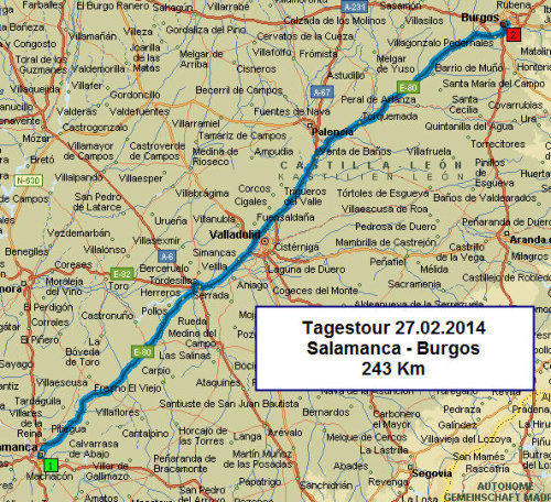 Heute fahren wir teilweise  die N630  und Autobahn Richtung Burgos und machen in verschiedene Orte einen Halt. Die Mentalität der Menschen zwischen Küste und diesem im Sommer heißen und wasserarmen Gebiet ist schon gewaltig unterschiedlich. Jeder Ort hat fast eine Kirche wenn nicht zwei. Alte und dem Verfall nahe Häuser findet man genug, auch alte Bauten  werden nicht erhalten, da hier in diesen ländlichen Raum mit den alten Gemäuern sicher kein Geschäft zu machen ist. Am frühen Nachmittag kamen wir in Burgos an, leider waren die im Stellplatzführer angeführten Plätze auch nur öffentliche Parkplätze mit Kurzparkzone. Wir fuhren zu dem Campingplatz Fuentes Blancas der doch etwas umständlich zu finden war, das Navi schickte uns immer im Kreis da die Straße zum CP erst neu gebaut wurde. Ein Pfadfinder findet alles manchmal eben auf Irrwegen. Am Campingplatz erfuhren wir , dass Bus Nr 27 in die Stadt fährt zum Plaza Espana. Der Stellplatz war aber vom Regen der hier niederging so aufgeweicht, dass ich es nicht wagte mit allen Rädern einzufahren. Das Aufstellen des Womo dauerte daher etwas länger. Meine Idee heute noch nach Burgos zu fahren hat daher keinen Sinn, in der Regel machen die Museen in der Nebensaison sehr bald die Pforten zu,.Für einen Abendspaziergang in der Stadt bzw. in der Altstadt ist das Wetter nicht recht einladend, wir sind auf 873 Meter und die Temperatur dementsprechend niedrig, um die 7°  und der Wind fehlt auch nicht.  Wir hoffen morgen ein besseres wärmeres Wetter zu haben.