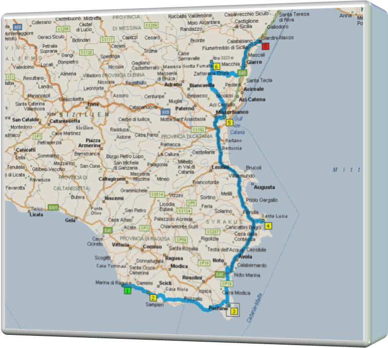 Es ist wieder ein schöner Tag etwas windig aber voller Sonnenschein, wir haben überlegt ob wir bleiben oder doch weiterfahren sollen. Wir haben uns aber gegen Mittag entschieden unsere Fahrt Richtung Siracusa - Catania fortzusetzen. Der Weg entlang der Küste war einfach wunderschön obwohl die Straßen einiges zum wünschen überlassen. In den Dörfer und Städte entlang der Küste sind die Straßen sehr eng, links und rechts der Straßen und Gassen ist alles verparkt. Ich habe mich oft gefragt wie im Notfall eine Löschfahrzeug oder ein größeres Einsatzfahrzeug durchkommen soll, dies ist einfach technisch/logisch gesehen gar nicht möglich.